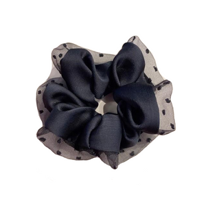 Dot Mesh Trim Chiffon Scrunchie in Black